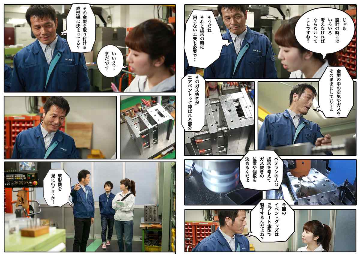 タイバー射出成形機の可動盤を支える棒であり、金型取付スペースの目安。